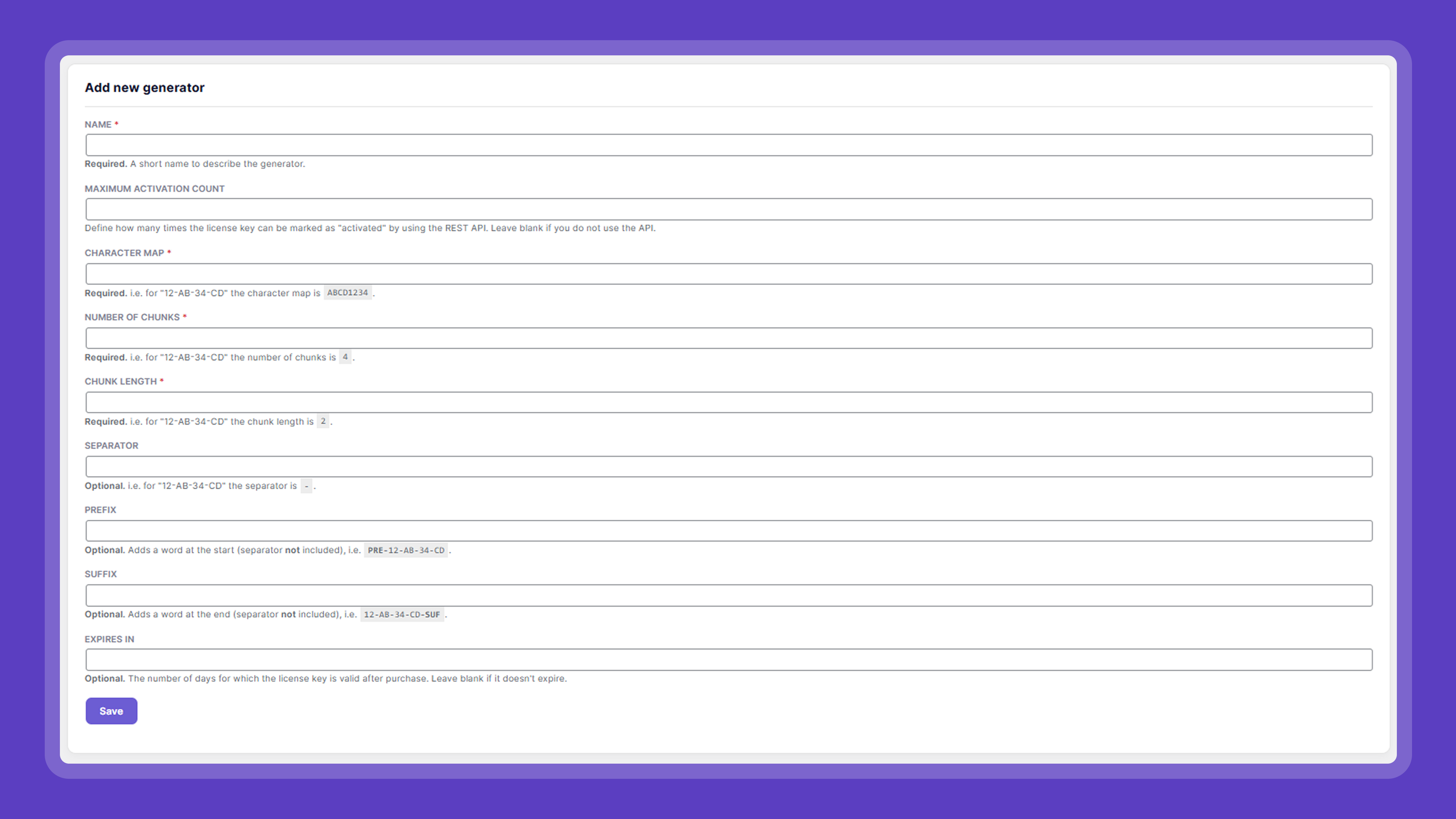 - Add – Generators can now freely generate license keys and add them directly to the database.