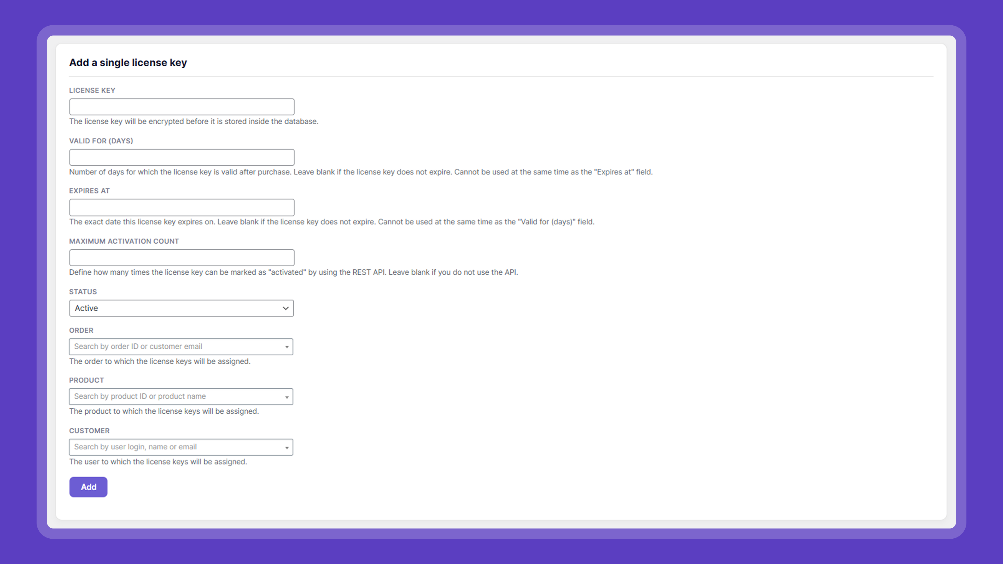 - Add – Select2 dropdown fields for orders and products when adding or editing license keys.