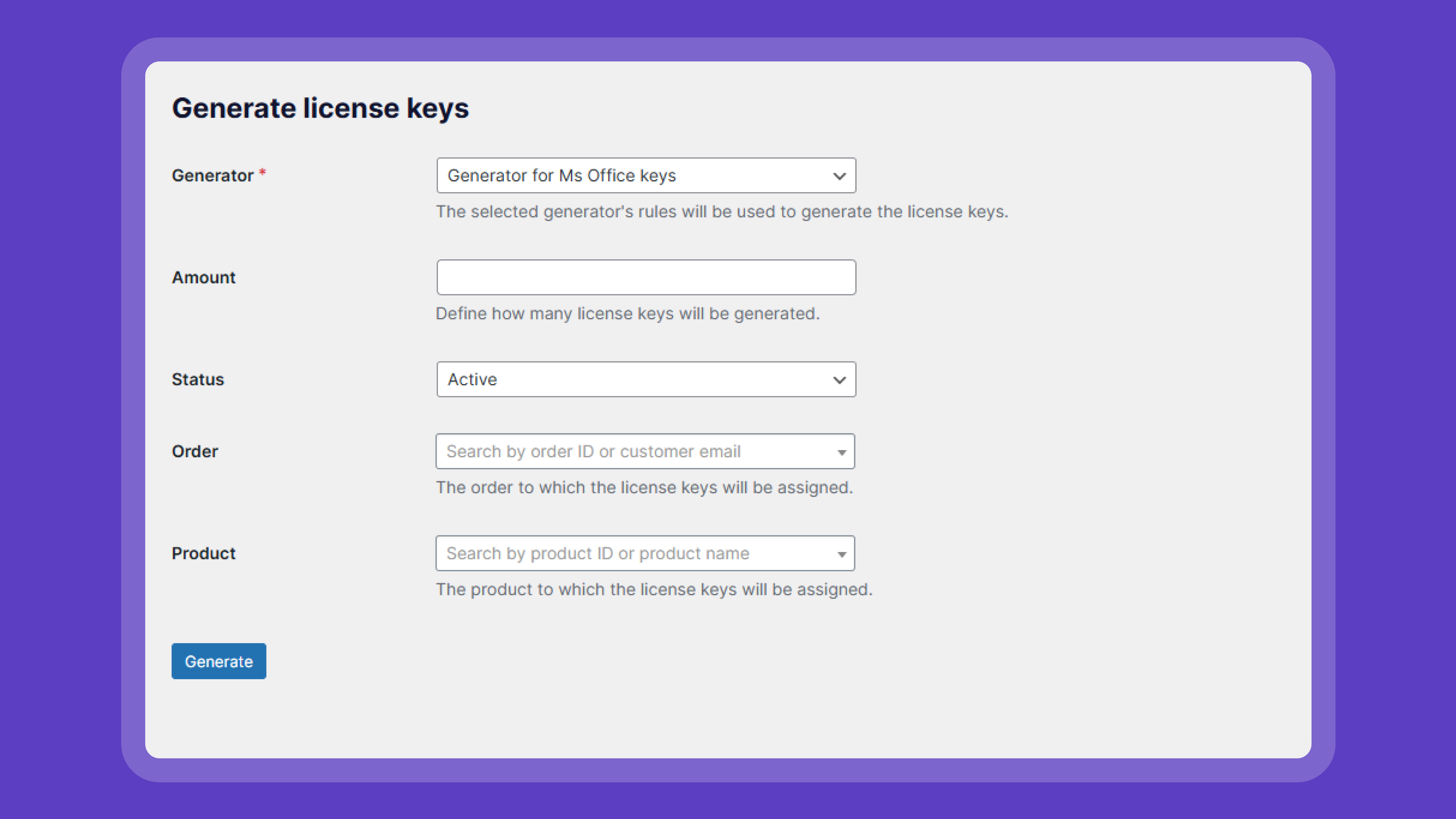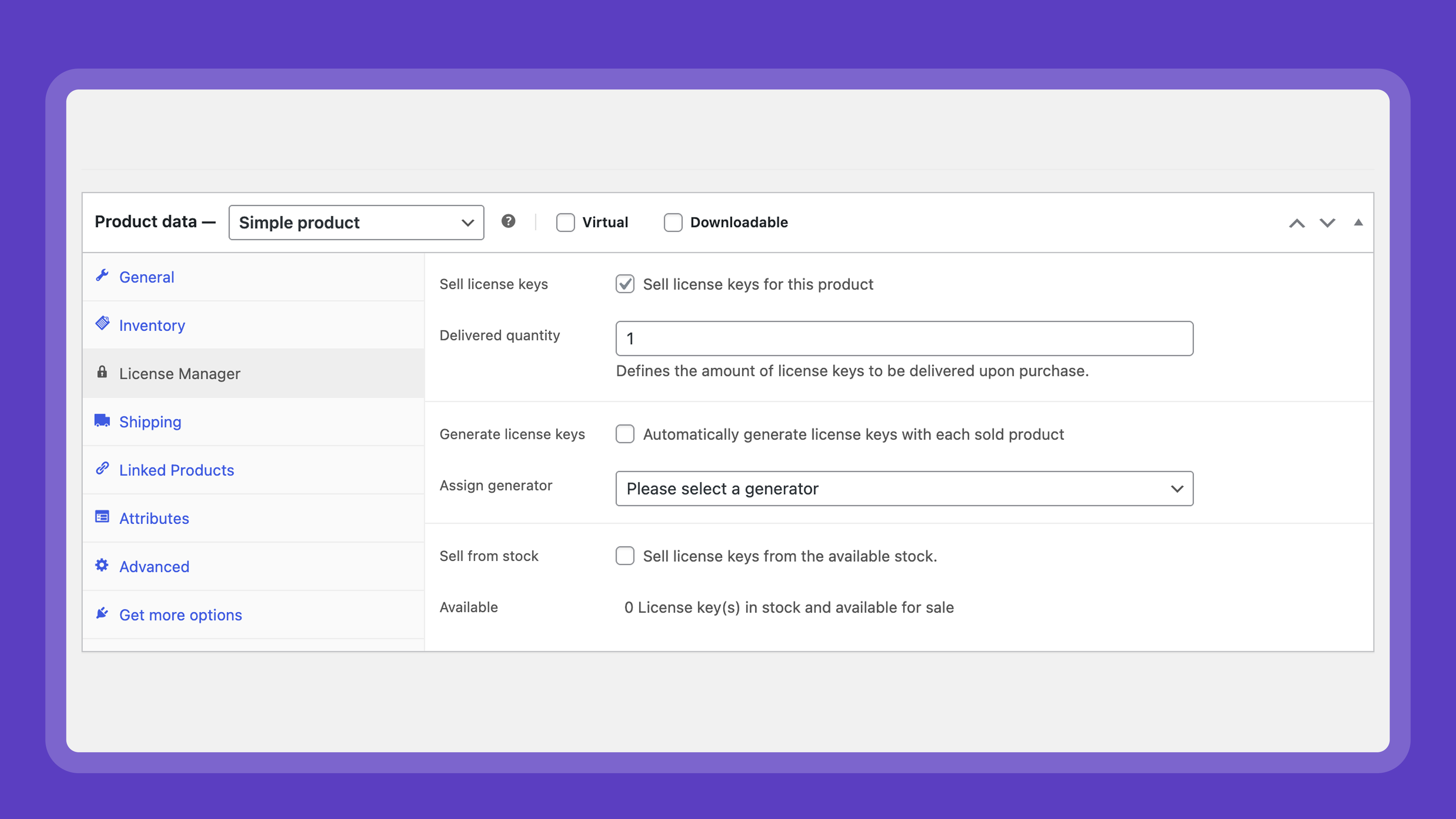 - Assign a generator to one (or more!) WooCommerce product(s), these products then automatically create a license key whenever they are sold.