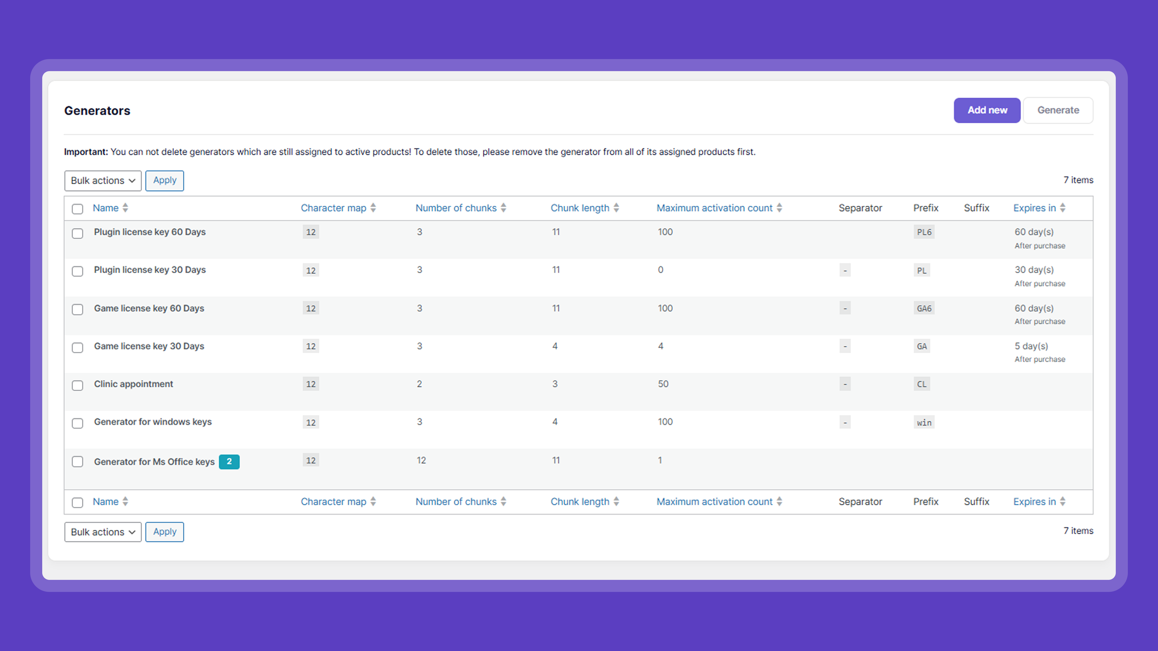 lmfwc_license_keys_table_heading). - Add – Generators now display the number of products to which they are assigned next to their name.